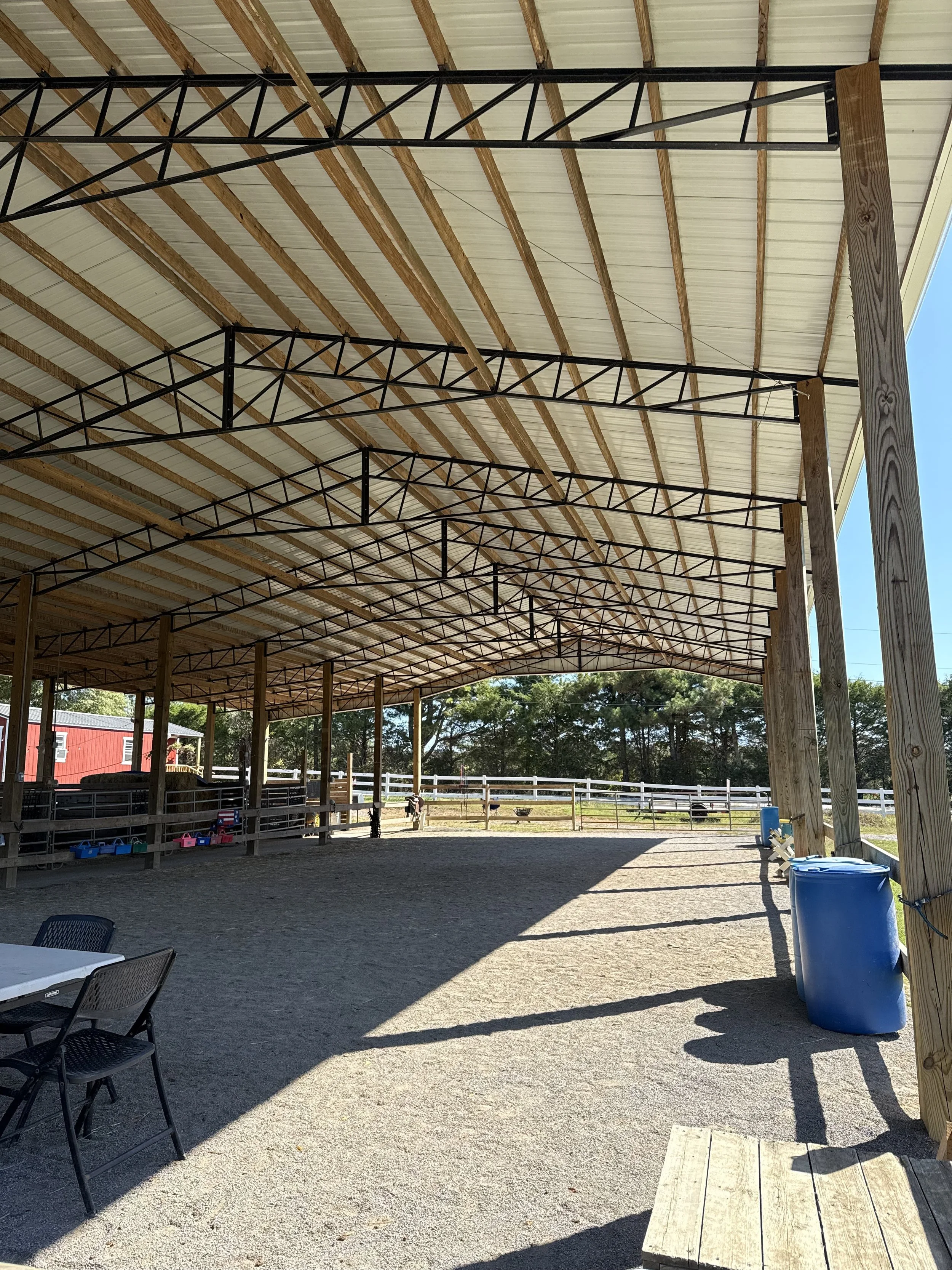 You and your horse will have access to our spacious 40 x 95 covered arena, designed for comfort, safety, and year-round usability. The high roof and open-air sides allow fresh airflow and natural light while keeping the footing dry on rainy days and shaded in the summer heat. Secure wooden posts and steel trusses create a bright, stable environment ideal for training rides, groundwork, and therapy sessions. The arena opens directly into the rest of the farm, giving horses a calm, connected view of their surroundings. Whether you’re polishing skills, exercising your horse during winter weather, or simply enjoying quiet time together, this covered arena keeps you riding in every season.